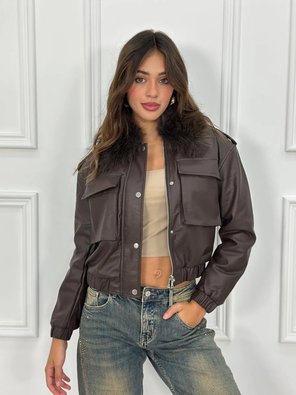 Chaqueta corta de piel sintética con interior y cuello de borreguillo