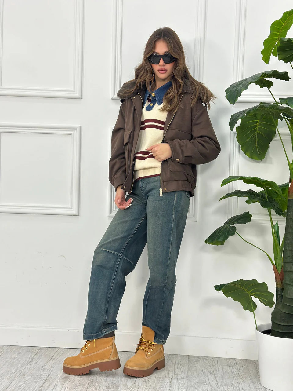 Chaqueta de ante con interior y cuello de piel sintética extraíbles.