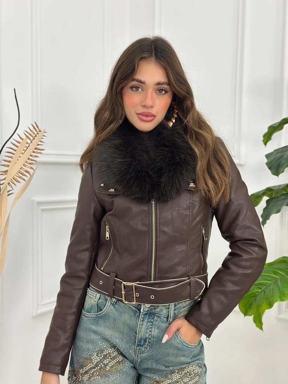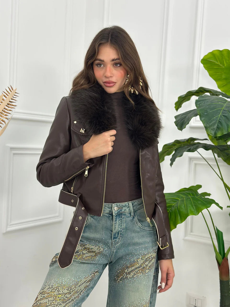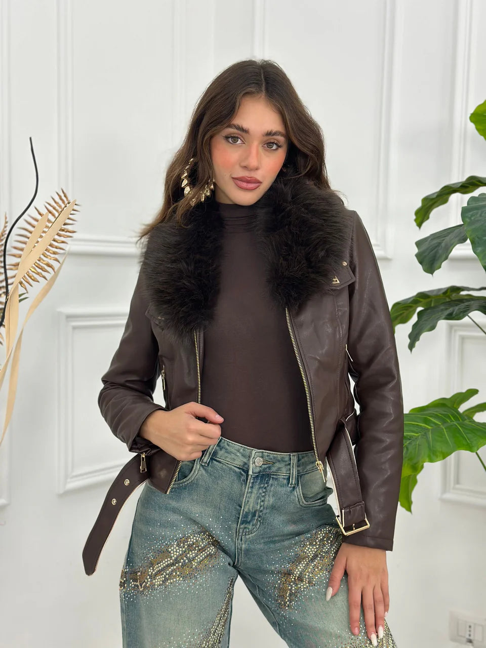 Chaqueta ajustada de piel sintética con cuello de borreguillo extraíble e interior